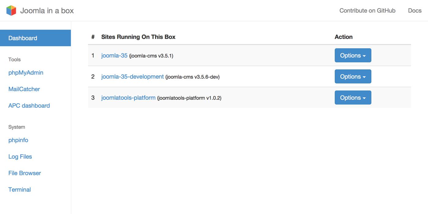The new Dashboard of the #joomla #vagrant box of @joomlatools is really cool. More info: http://t.co/Aw4sCbmw6k pic.twitter.com/KzdwfyAYCd