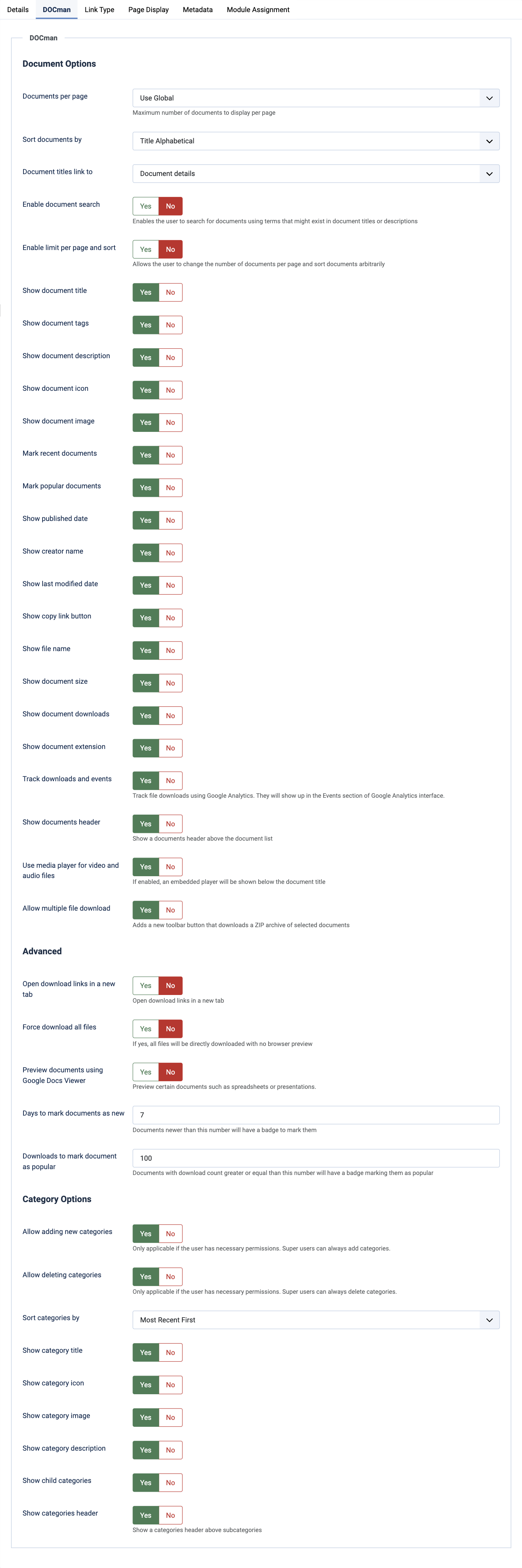 - Only show own categories: set to Yes to only include the document categories owned by the logged-in user.