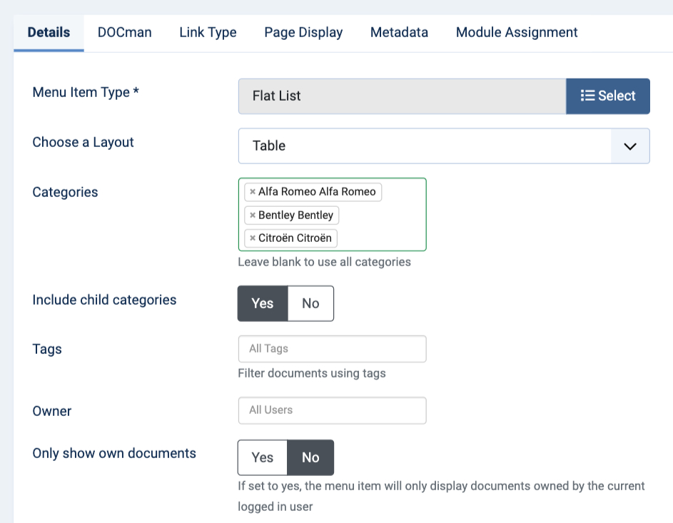 - Only show own documents: set to Yes to only include the documents owned by the logged-in user.