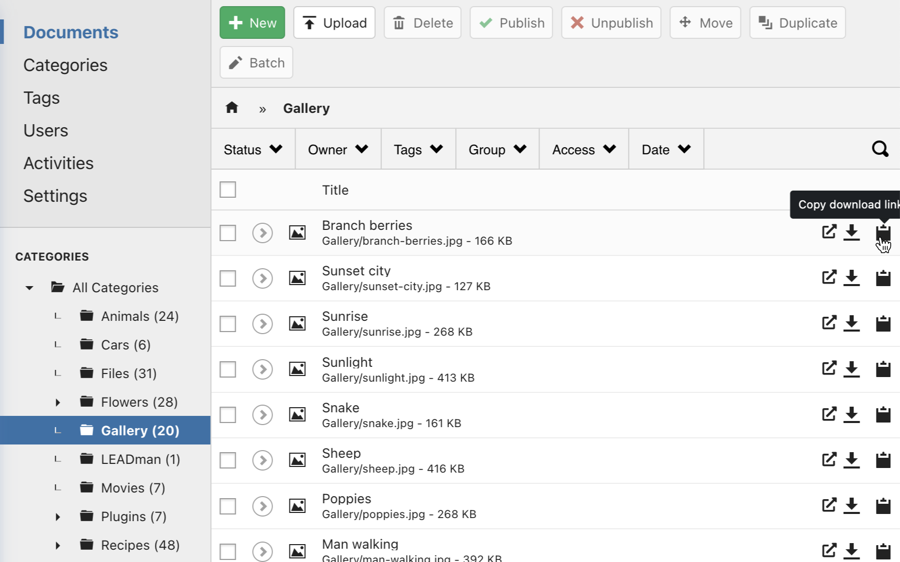Easily share the link for a single document, for instance in a newsletter, email or social media post, without having to create a menu item.