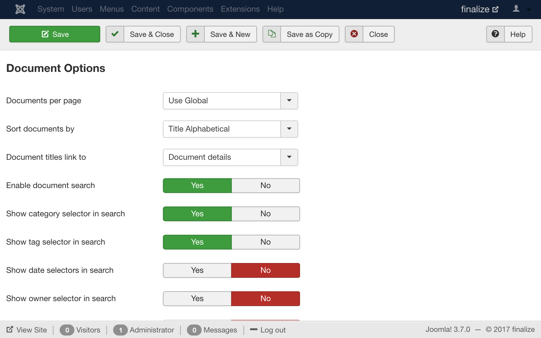 All search fields can be disabled through menu item parameters for a custom, cleaner interface. In addition, the tag filter only shows tags that are attached to one or more documents in the current menu item.