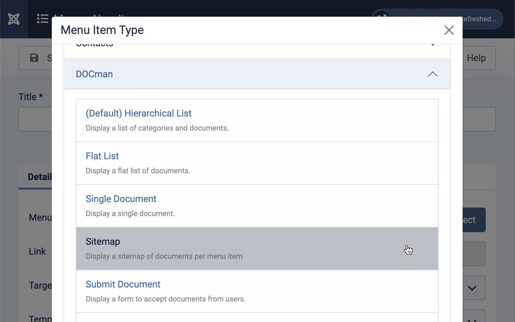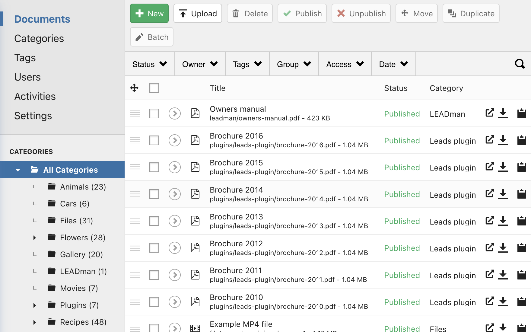 DOCman blends seamlessly into the template of your website. It also comes with various Menu Item Types like a list, table and tree view.