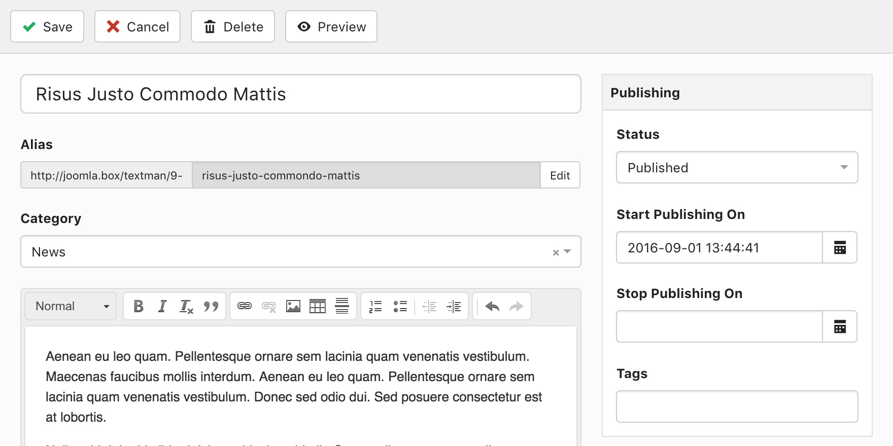 TEXTman features a built-in light and simple editor for editing and managing articles without the complexity of the administrator interface.