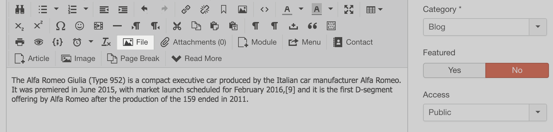 - Create a new (or edit an existing) Joomla article.