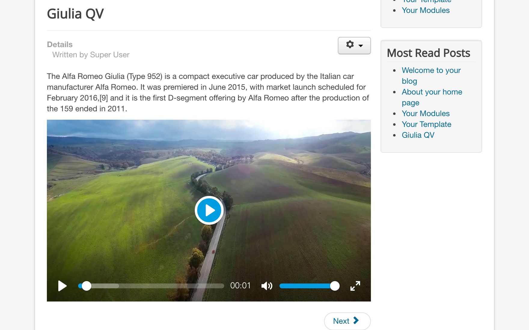 If you upload a supported video or audio file in FILEman, you'll see that the file links get automagically replaced with the video playing inside our media player. You can either directly link to a FILEman file from a menu item, or you can insert the video in a Joomla article using the editor's "File" button.