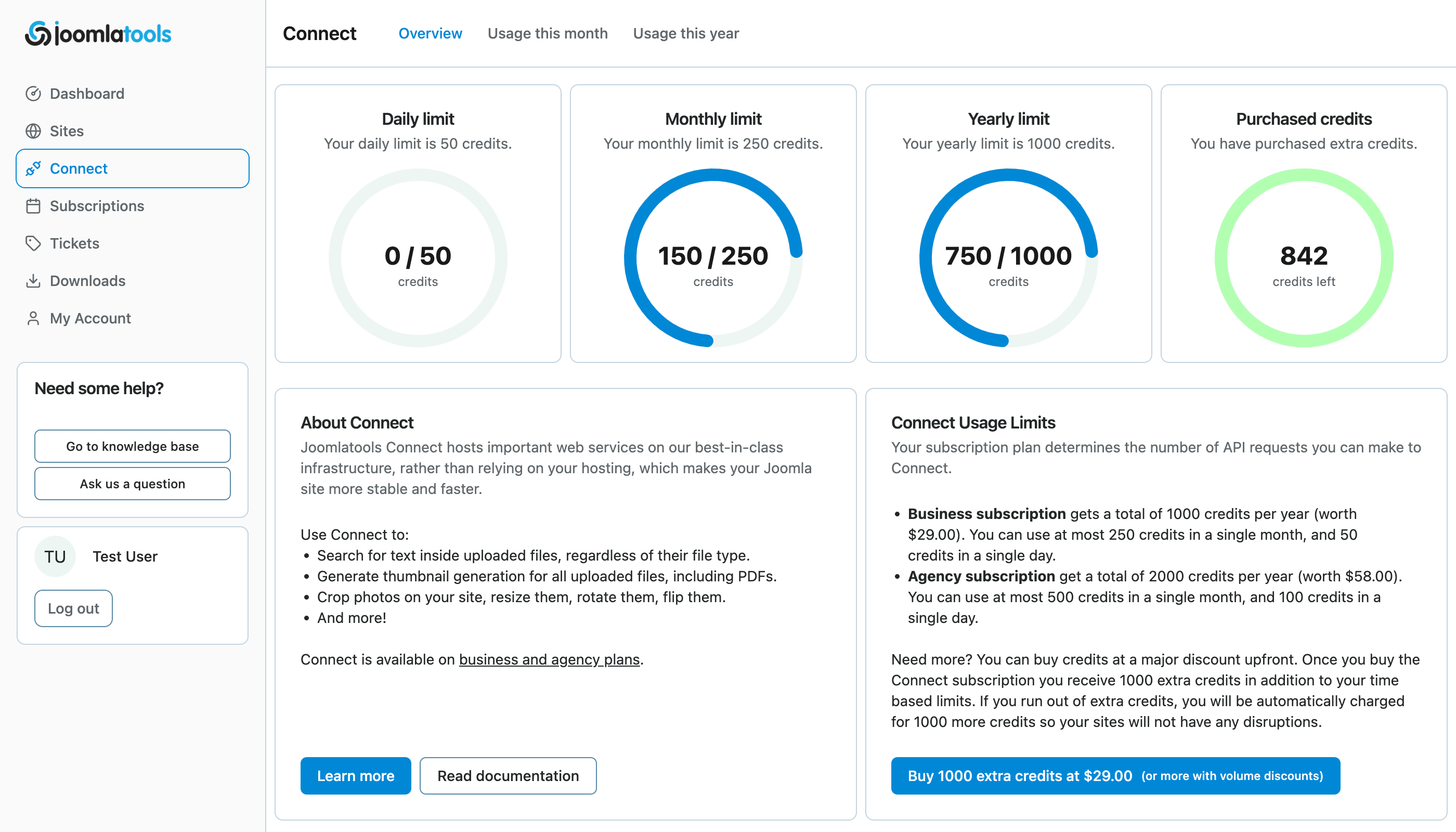 - Usage this month and Usage this year tabs will show you the respective used Connect credits per site and which features these credits were used for.