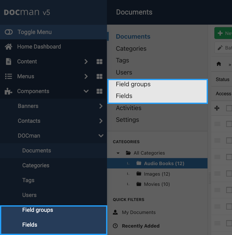 From the sidebar menu click the Components down arrow, then the DOCman down arrow to see the Fields and Field Groups links, both links are also available via the DOCman dashboard.