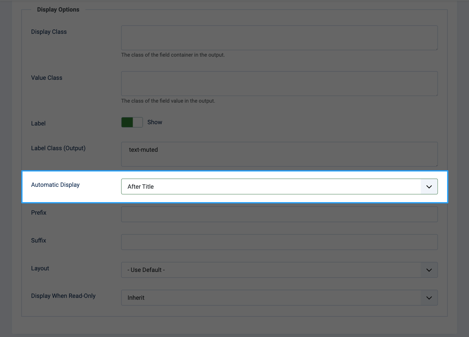 Scroll down to Display options then to the Automatic Display parameter, from here you can select to automatically display the custom fields after the document's title, before the document's description, or after the document's description.