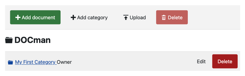 Congratulations! You just added your first DOCman category, to add more just click on the New button in the toolbar, whenever you navigate to Components > DOCman > Categories, or from the Add Category button in the frontend toolbar when you're logged in as a user with category create permissions.
