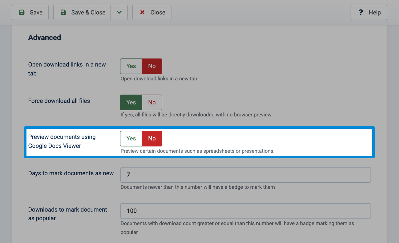 - Under Advanced set Preview documents using Google Docs Viewer to Yes.