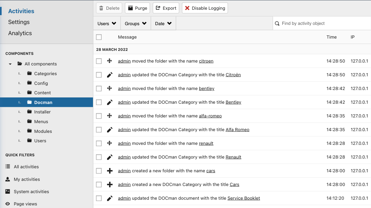 Last updated: 27 February 2024LOGman has built-in support for DOCman and when installed LOGman will log all performed actions, like: