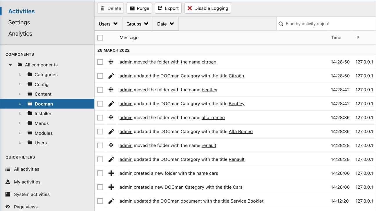 Starting with DOCman 4, you can view a document's add, edit, delete and download activities from within the document's Activities tab.