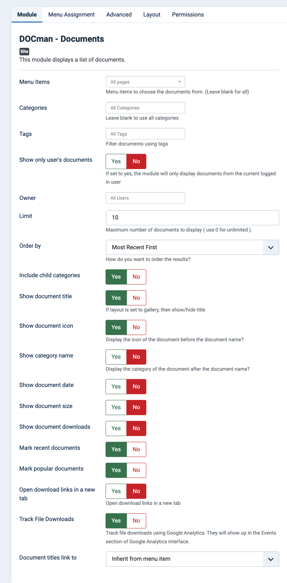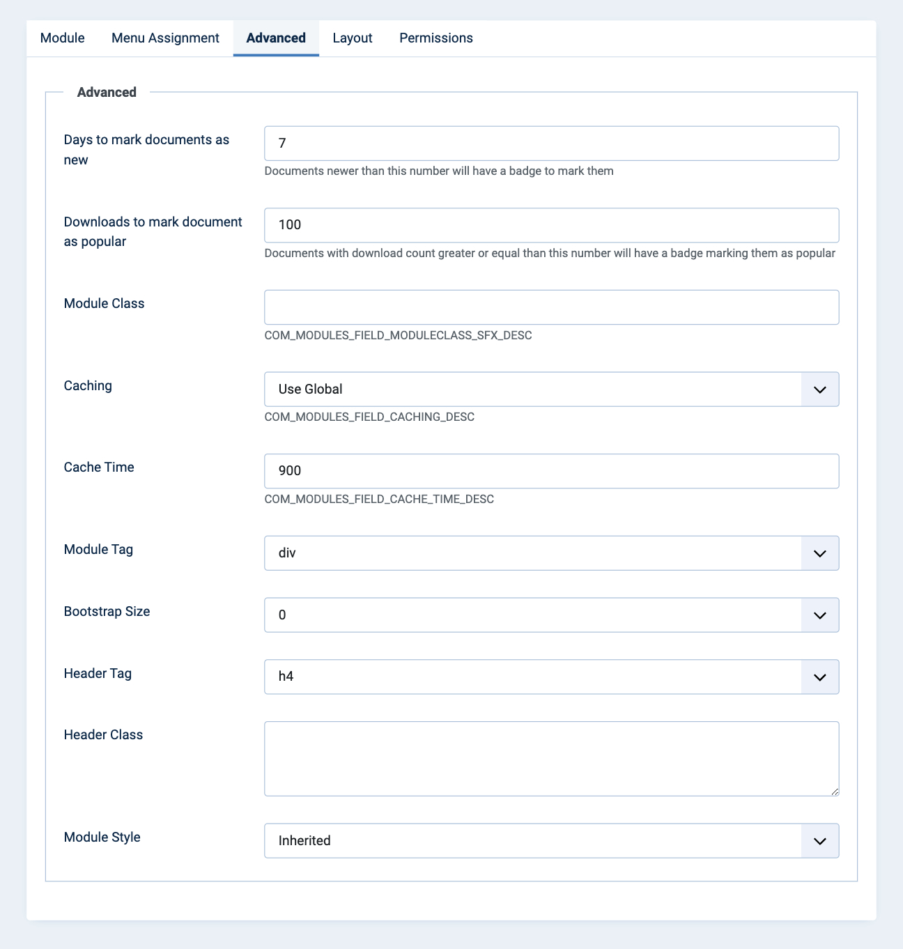 Set the number of days a document should be considered as new, set how many downloads a documents must have had before it can be marked as popular, change the module's layout and more.