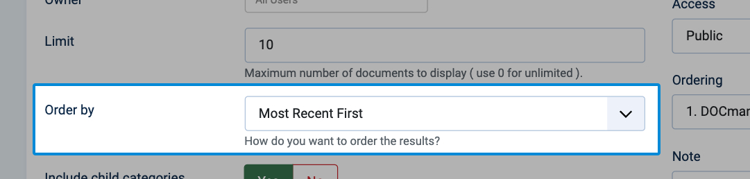 You can create a list of newest or last added documents by select the appropriate value in the Order by parameter:
