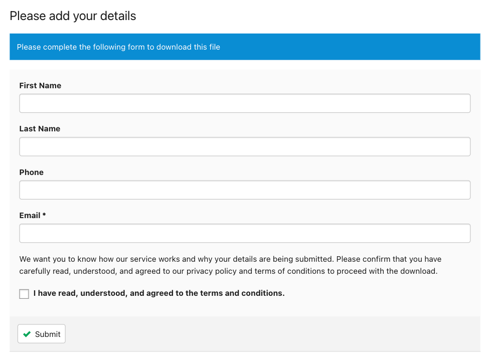 The LEADman for DOCman plugin displays a simple form when a visitor wants to download a document. The download will start after the visitor submits the form.