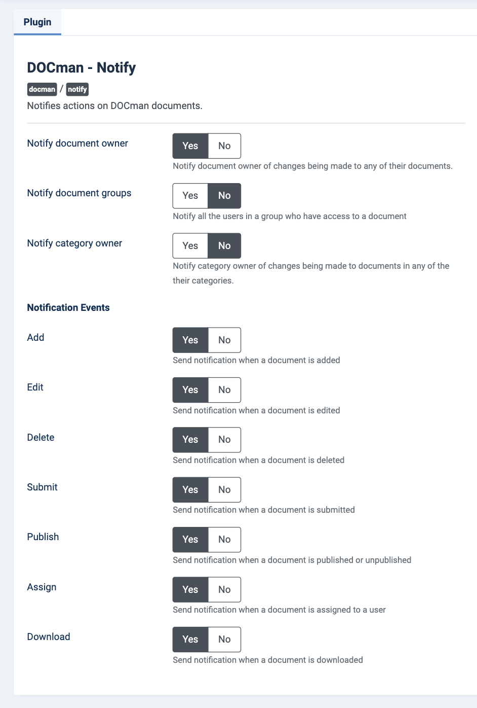Last updated: 28 March 2022DOCman Notify is a plugin that sends notification emails to document owners, category owners and document groups about changes in those documents and categories that they manage.