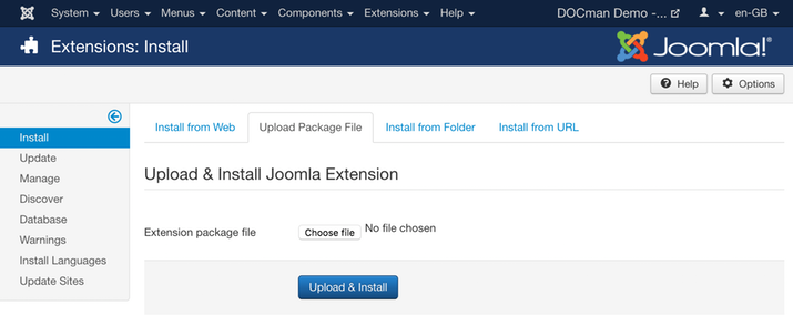 Upgrading to DOCman 3.x is done via the standard Joomla extension installer. Navigate to Extensions > Manage > Install. Then select the Upload Package File tab.