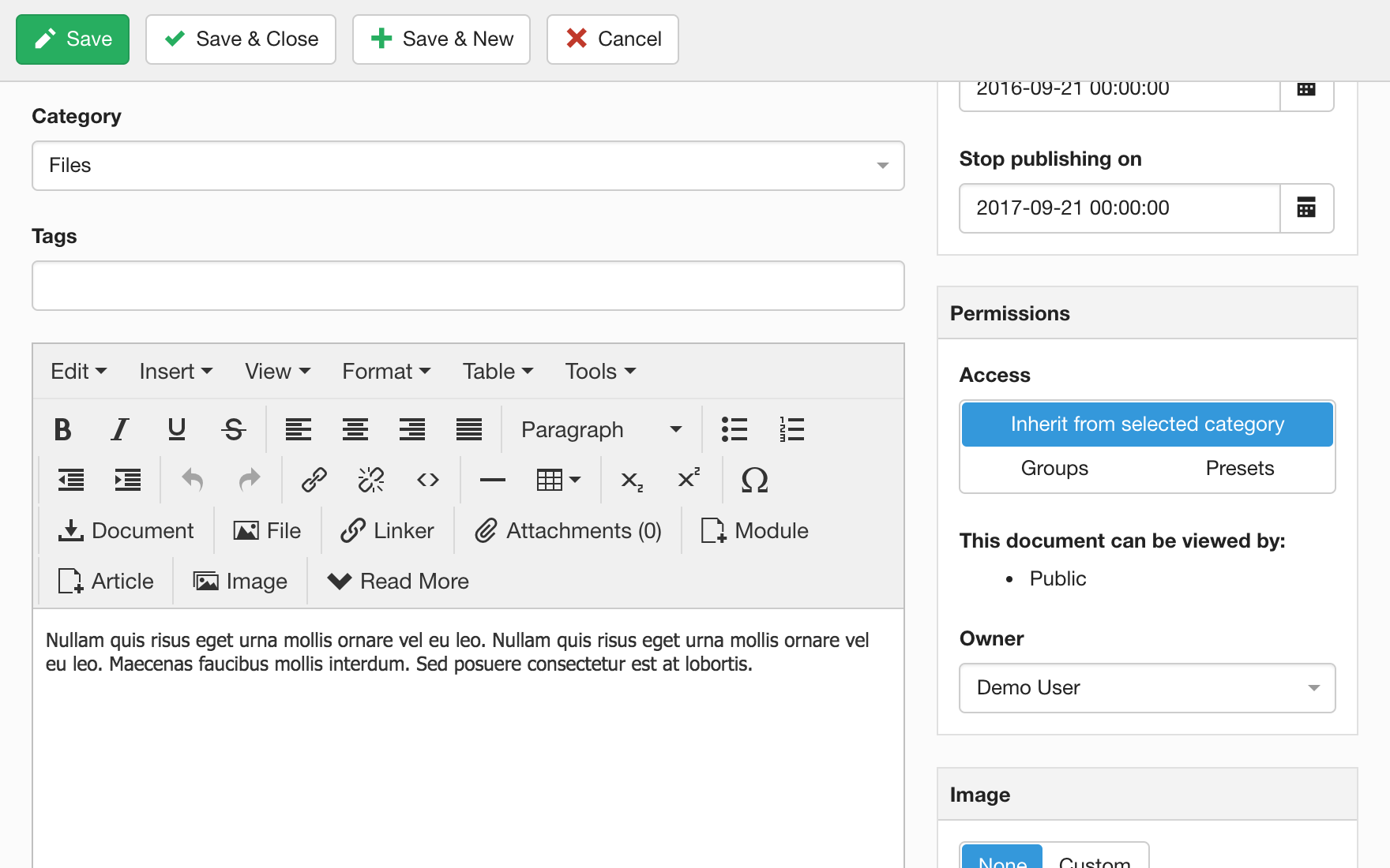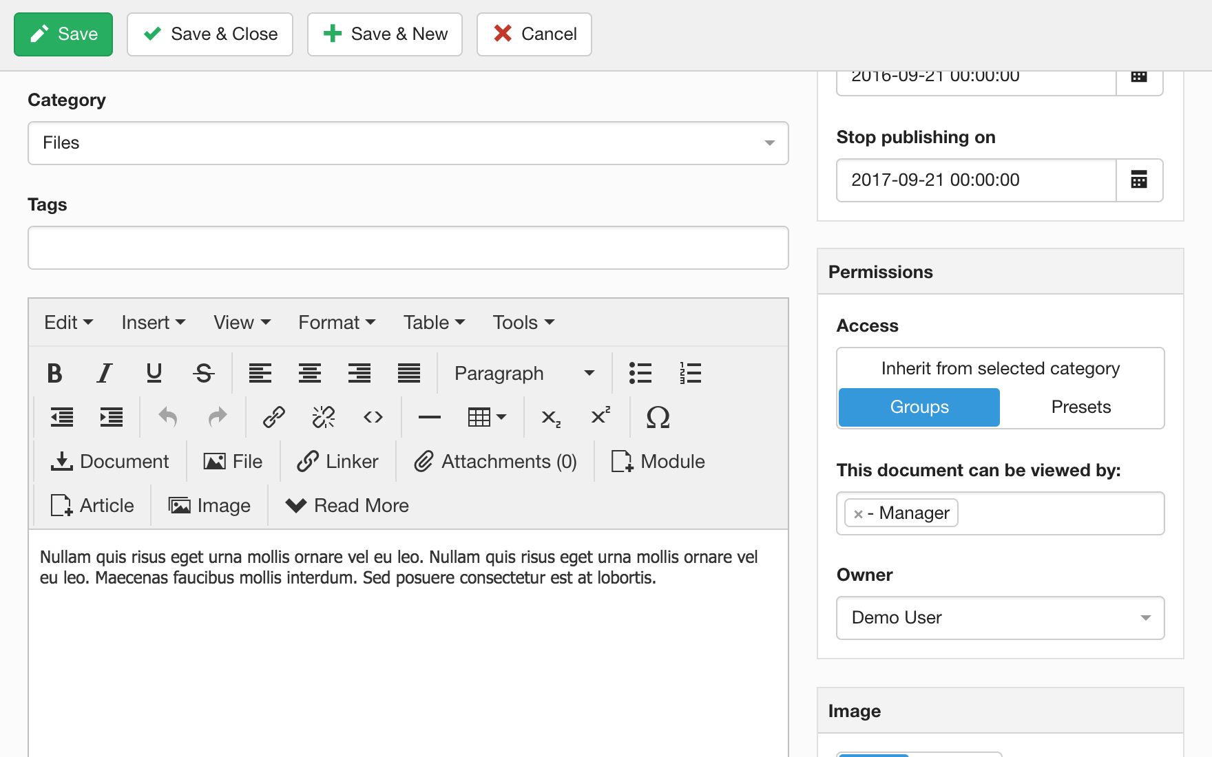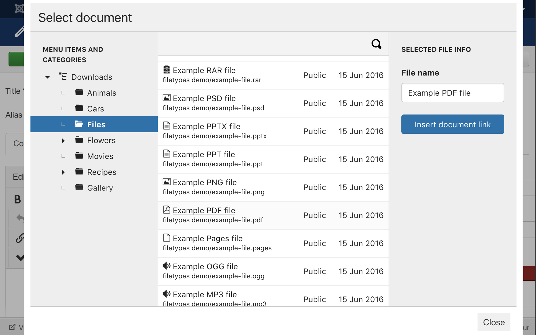 Easily insert links to documents into articles using the DOClink editor plugin, you can even insert links to categories and menu items.