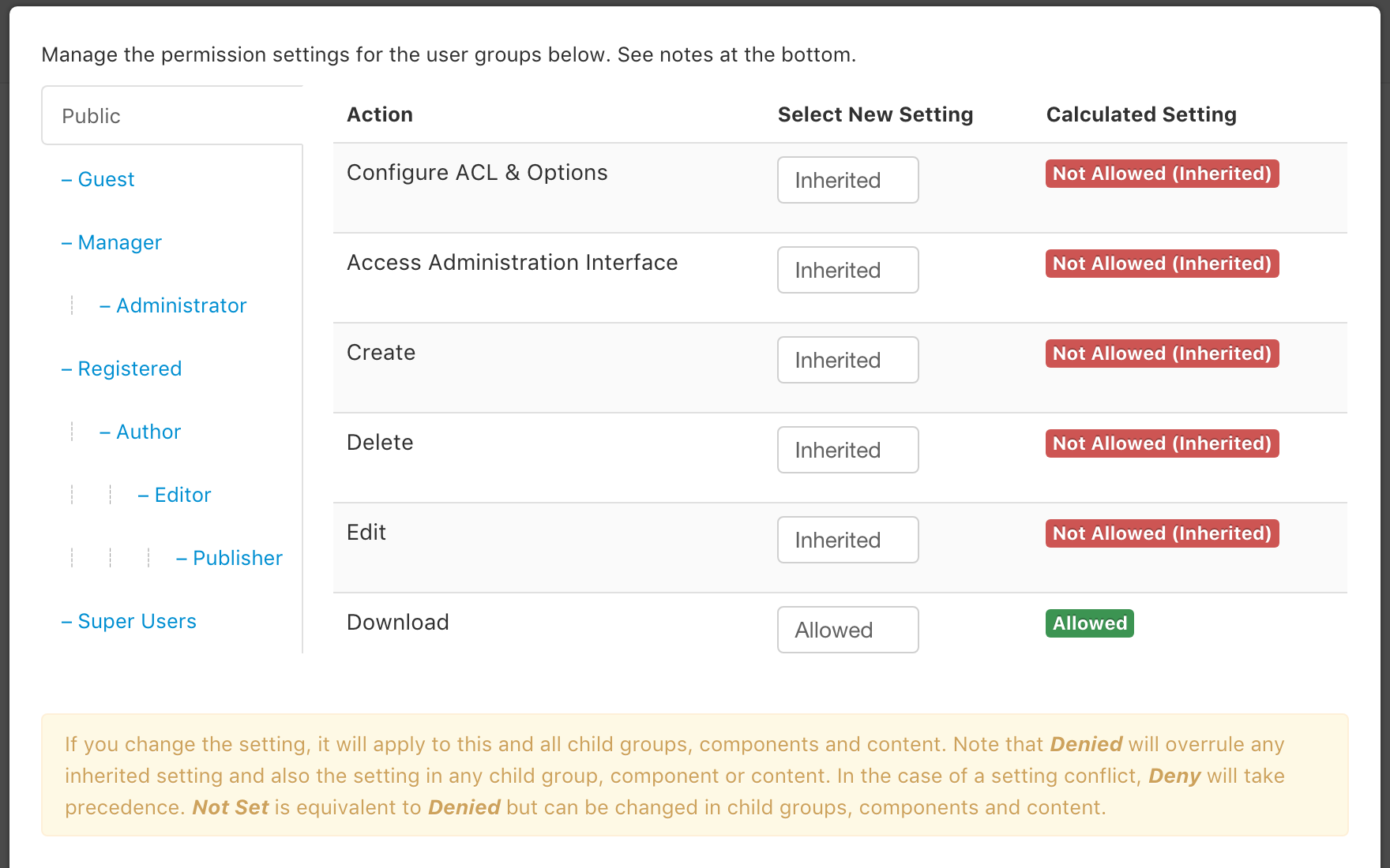 DOCman supports the Joomla permission system. You can define add, edit, delete, upload and download permissions for categories and documents.