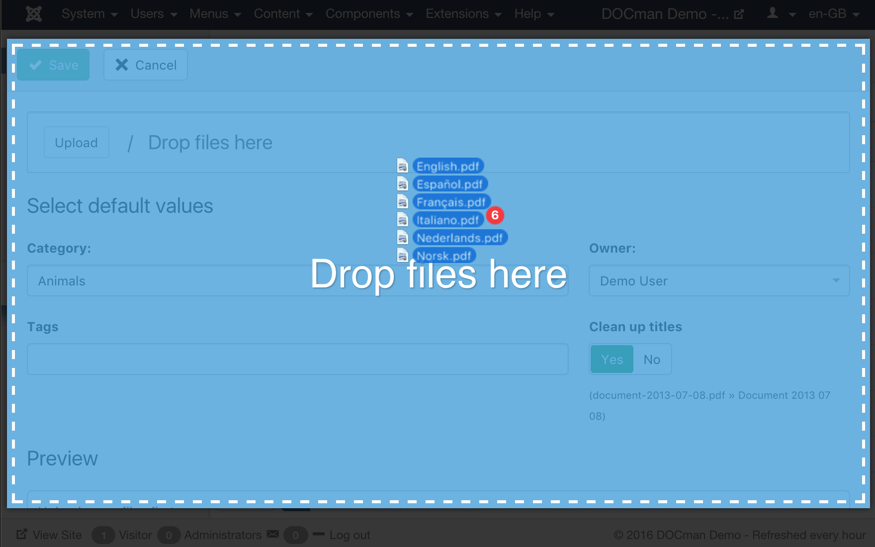 DOCman offers a simple way to allow users to submit documents using drag and drop from the frontend with integrated notification support.