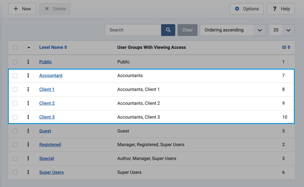 - Set the Access Level of the Menu Item to the Access Level you created for that client