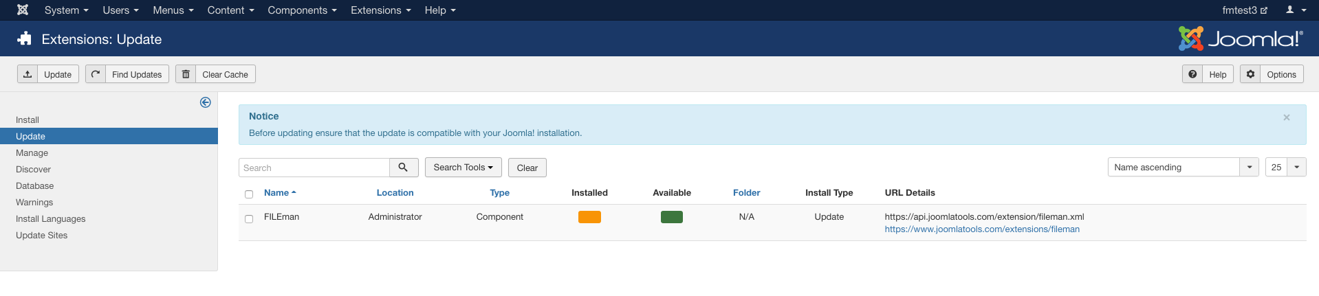 Upgrading to FILEman 3.1 is done via the standard Joomla extension updater. Navigate to Extensions > Manage > Update. Click Find Updates in the toolbar if you do not see FILEman in the list. Then select FILEman and click Update in the toolbar.