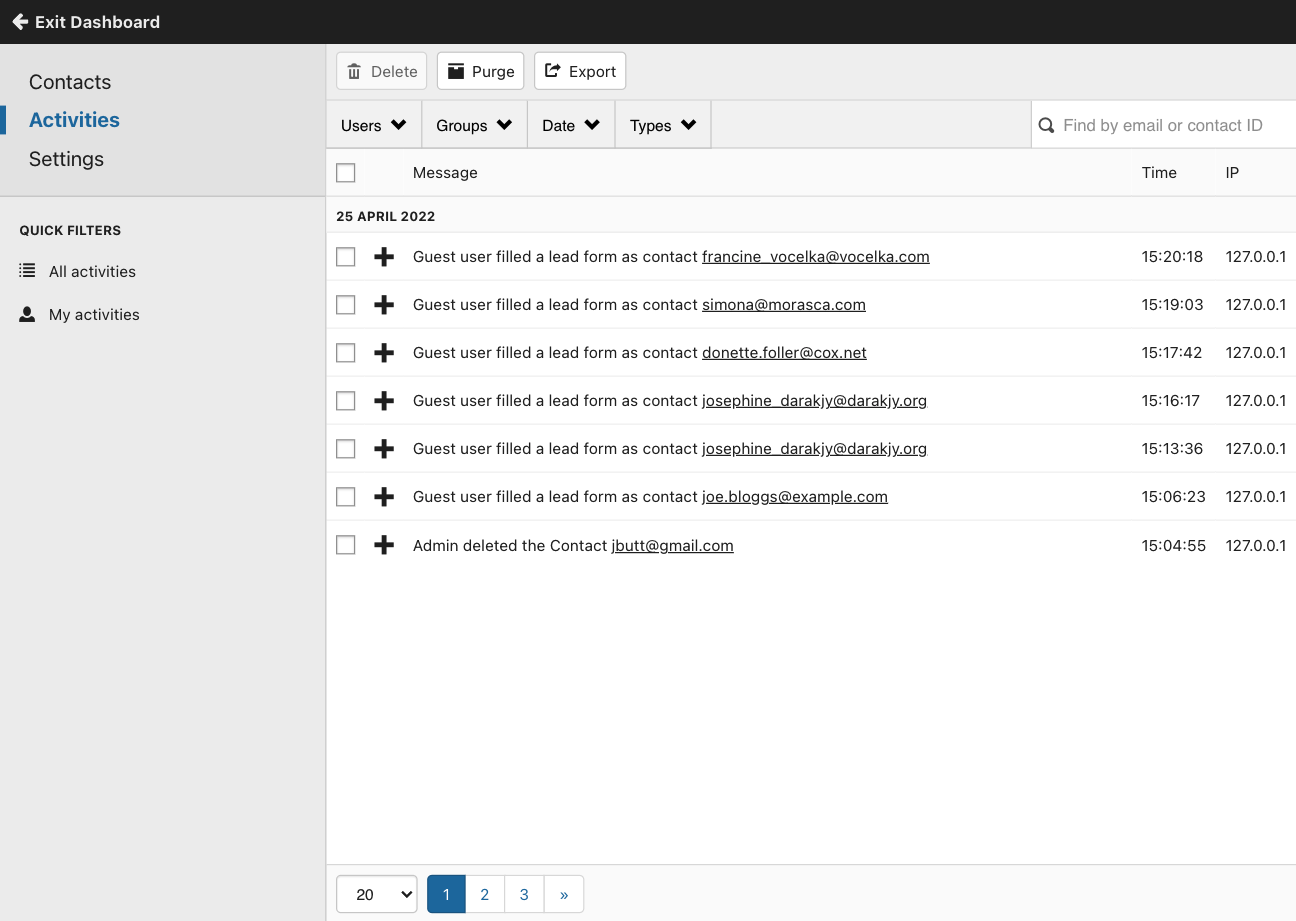 Last updated: 25 April 2022LEADman tracks creation, modification, and deletion of contacts. In a contact form, you can see the list of activities associated with that contact under the Activities tab.