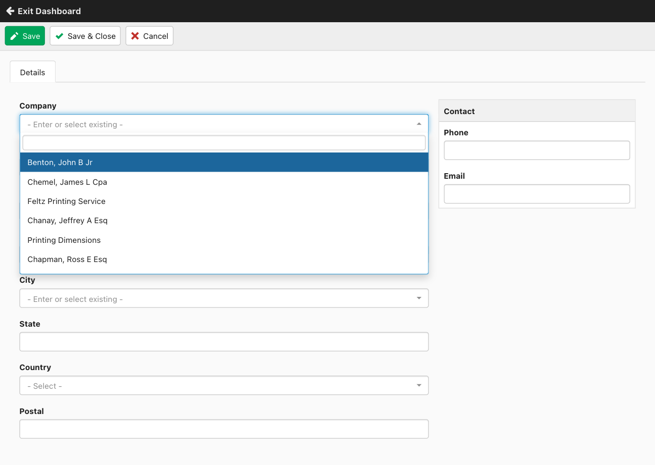 Last updated: 25 April 2022When creating or editing new contacts in the dashboard, if a company already exists then you can select it as you type.