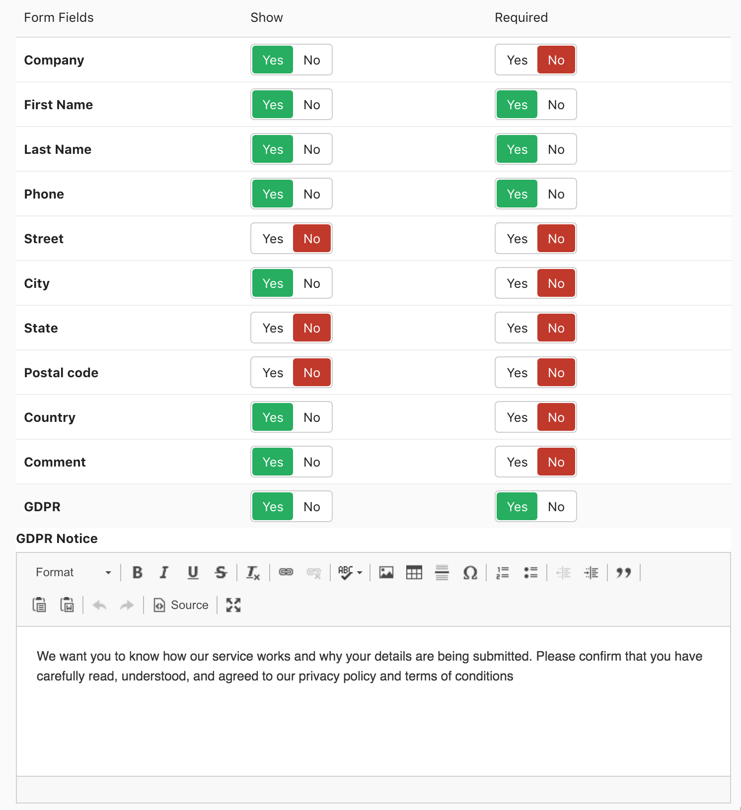 - GDPR Notice Displays a text notice next to the GDPR consent checkbox