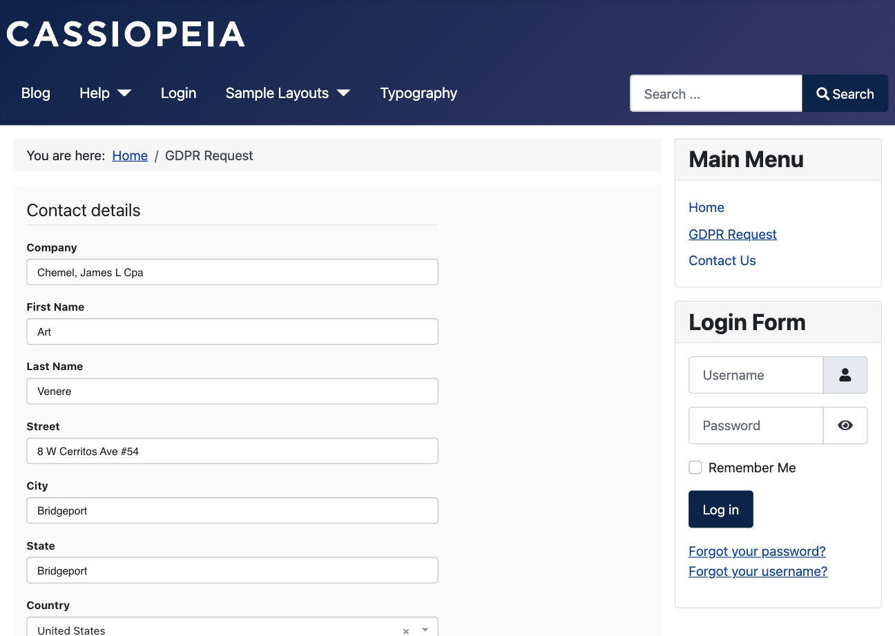 Last updated: 25 April 2022The passwordless contact profile allows your contacts to view and manage their data without the need to create an account on your website. The contact can request a time-limited unique url that will give them access to a page on your Joomla website with the data that you collected from them, helping to make your website GDPR compliant.