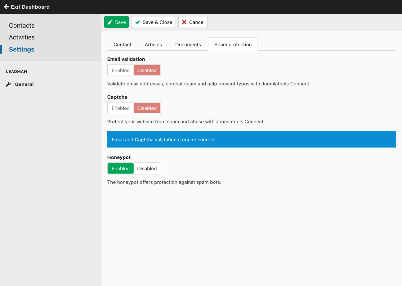 Last updated: 25 April 2022To secure public-facing lead capturing forms such as the contact form, articles, and document view or download forms, you can enable the honeypot spam filter. Go to LEADman dashboard > Settings and click on the Spam protection tab, once there enable Honeypot.