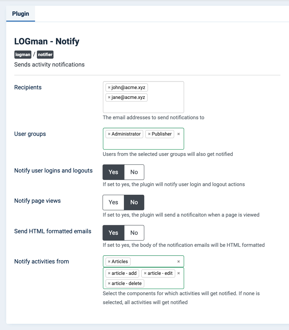 When an activity is logged by LOGman, the plugin will send a notification email to each address that is listed in the plugin settings.
