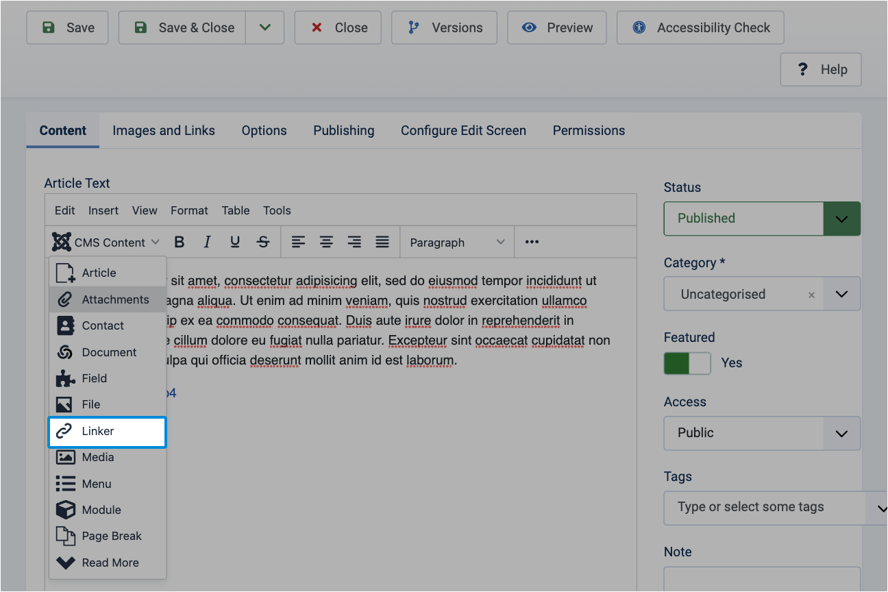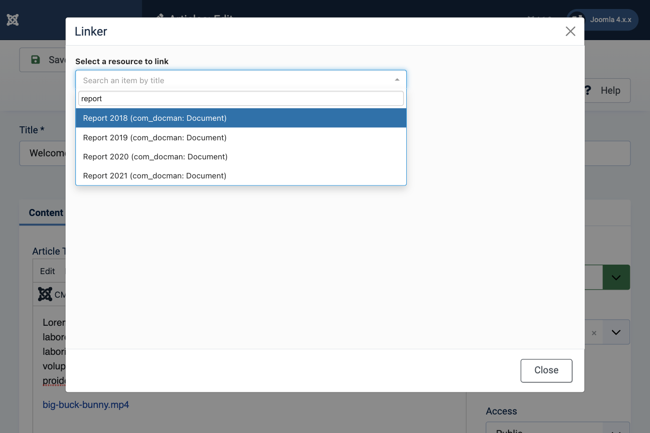 Note: Since LOGman 4.0 the Linker plugin filters the search results so that only relevant linkable resources are returned, i.e. articles, DOCman documents and/or FILEman files.