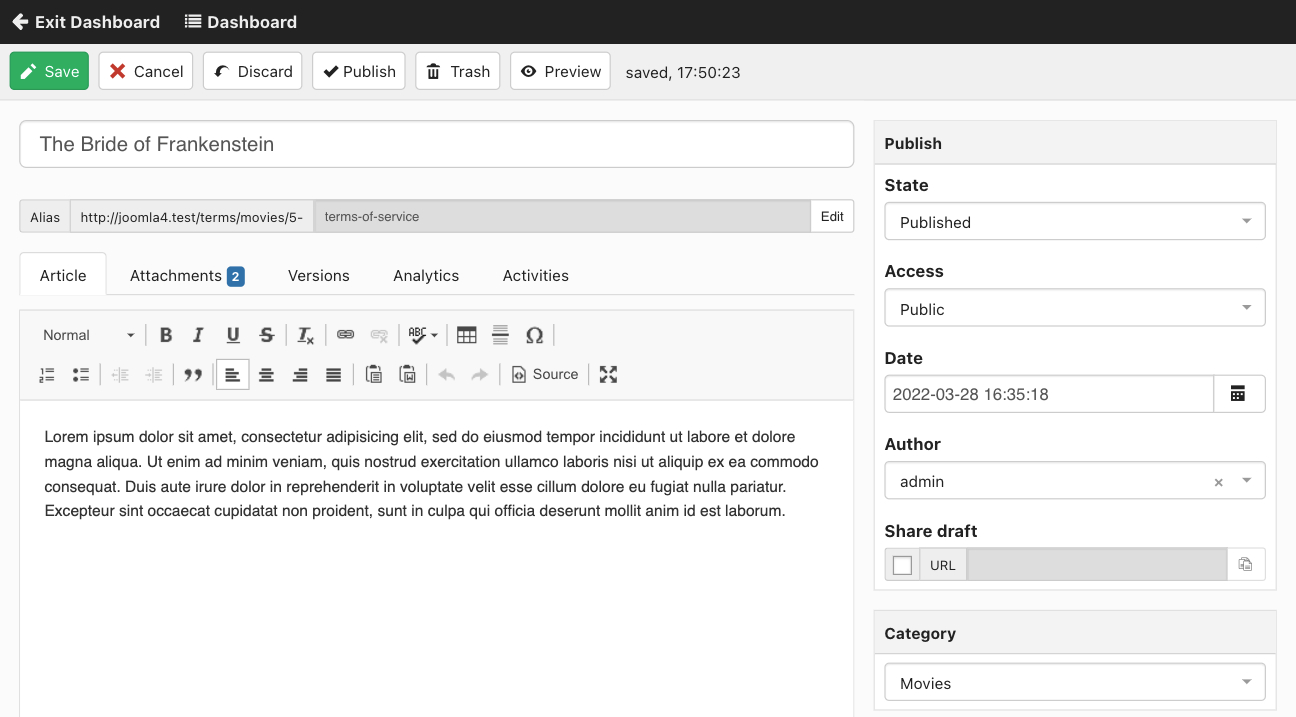 The article editor is where you can you edit and update your article change the title and url alias. On the right hand side you will find a sidebar with different additional properties for the articles.