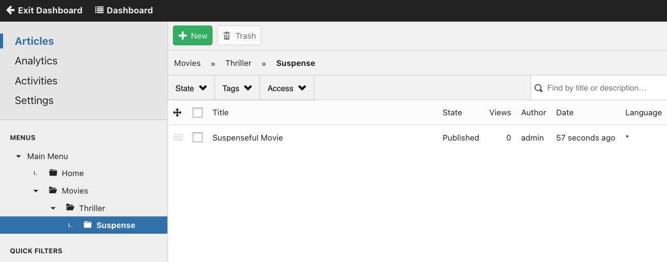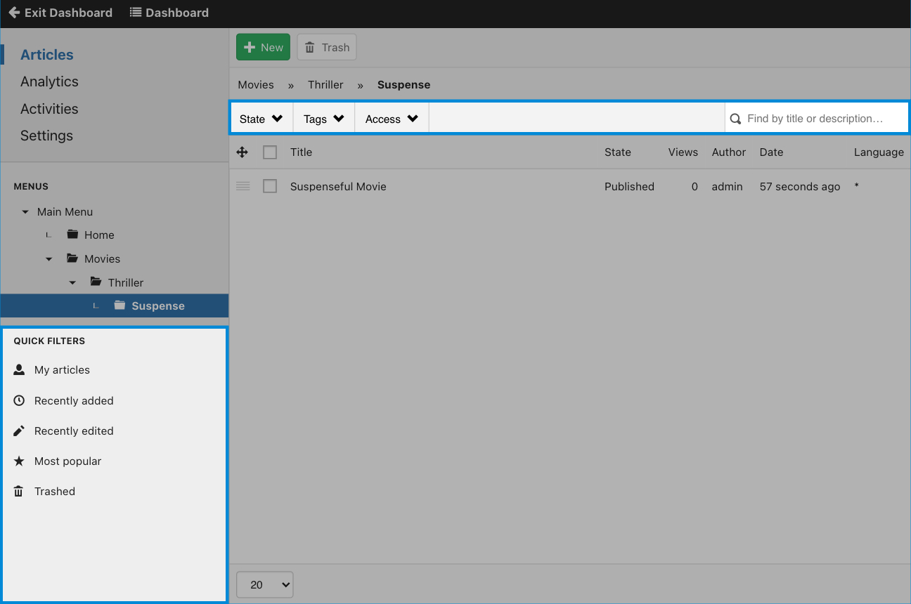 Articles can be filtered using the quick filters on the left or using the status, owner, tags and access filters on top of the list.