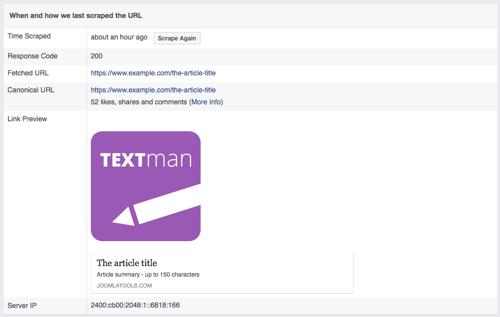 When one of your site's URLs is shared for the first time Facebook saves the metadata details for the page, as explained above, if you later decide to update any of the page content or metadata details and then re-share your site's URL, those changes will not be reflected on Facebook, you must request a re-scrape of your page's metadata from Facebook.