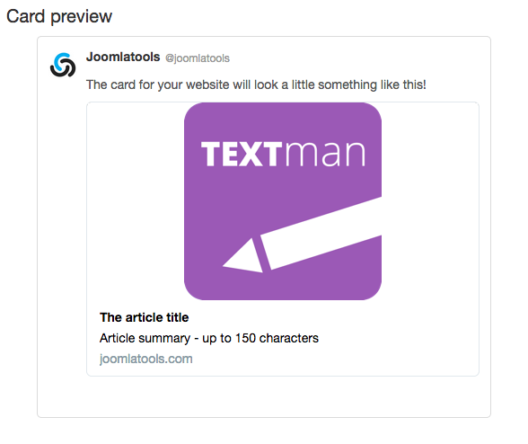 Social sharing of articles is not natively supported by Joomla. TEXTman adds support for Twitter Cards and Facebook Open Graph to your Joomla articles by adding additional markup to your webpage making your articles more easily crawlable by popular social media networks like Twitter, Facebook, Google+, and Pinterest.