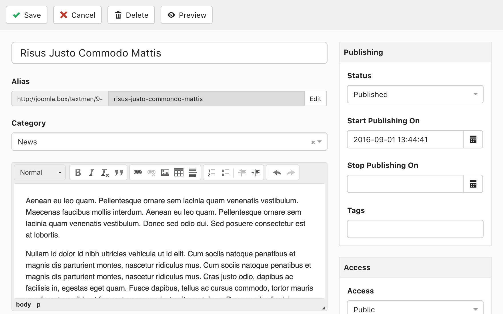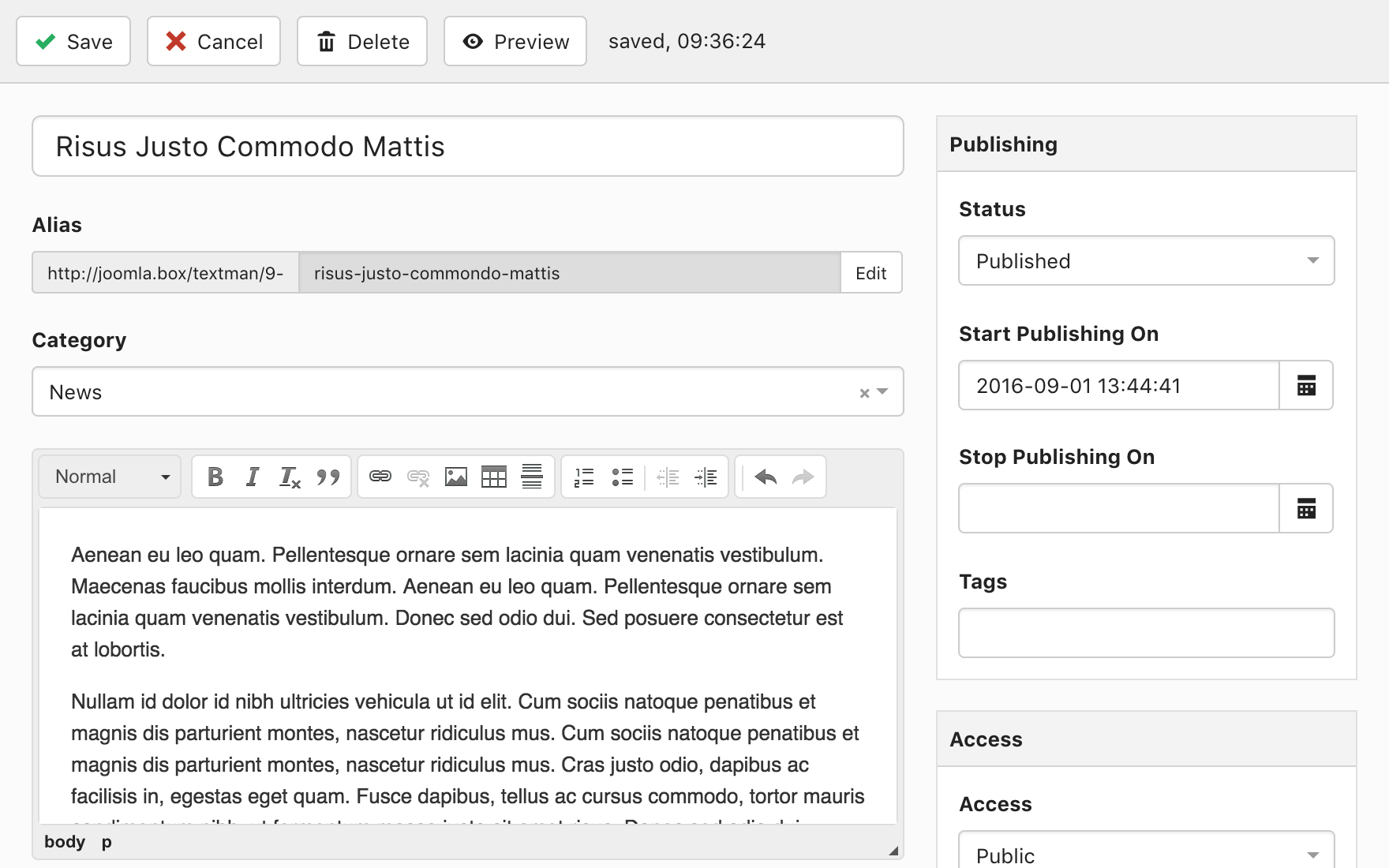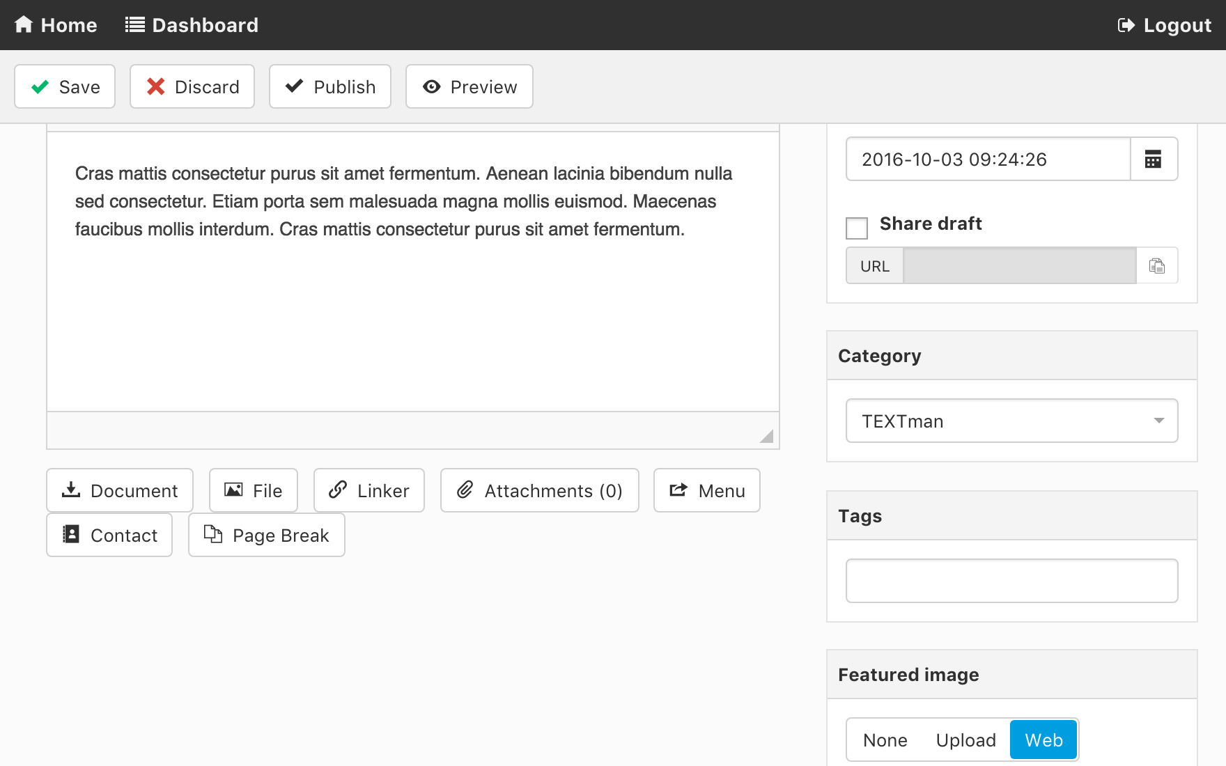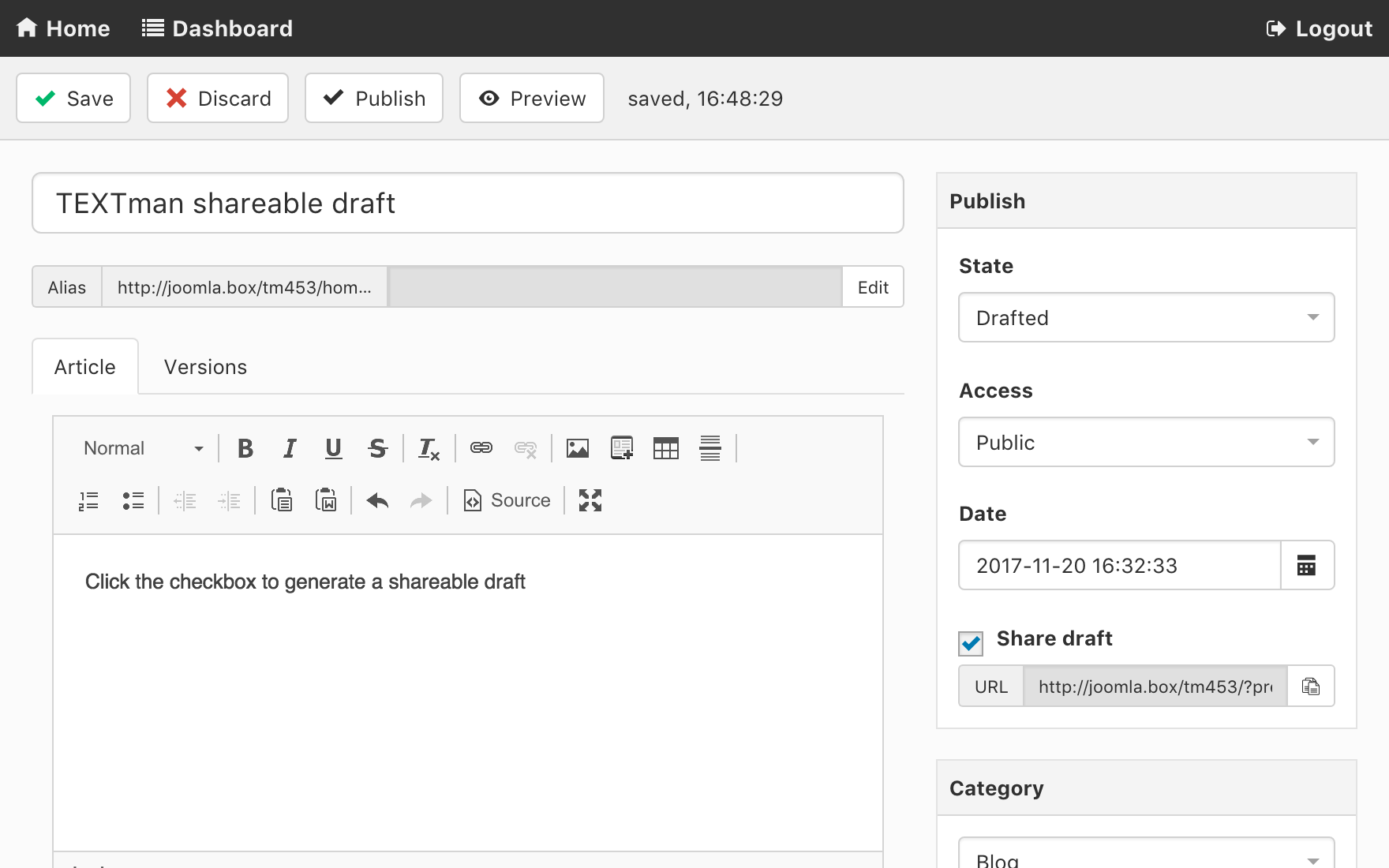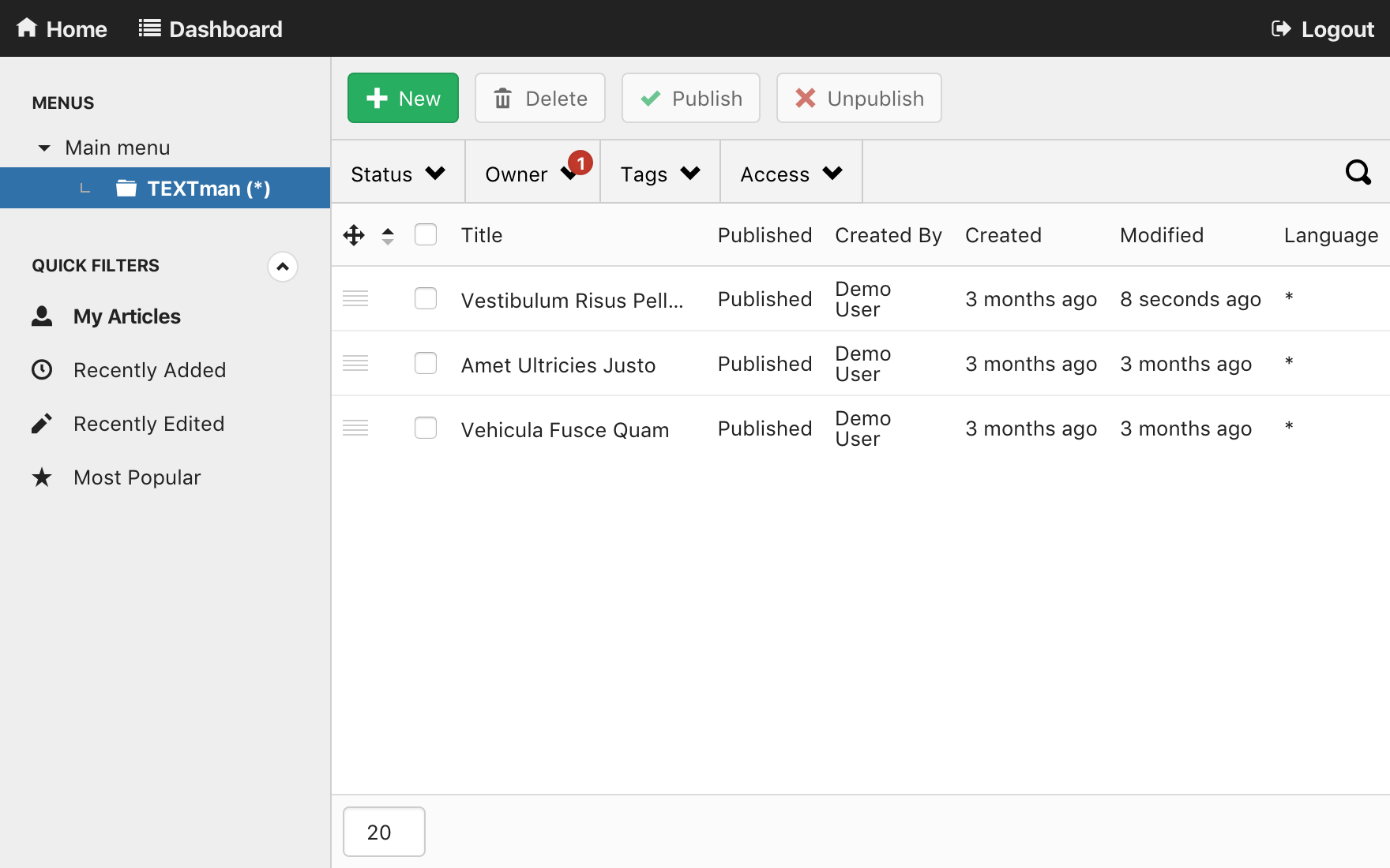 TEXTman provides an easy to use dashboard to manage your Joomla articles.