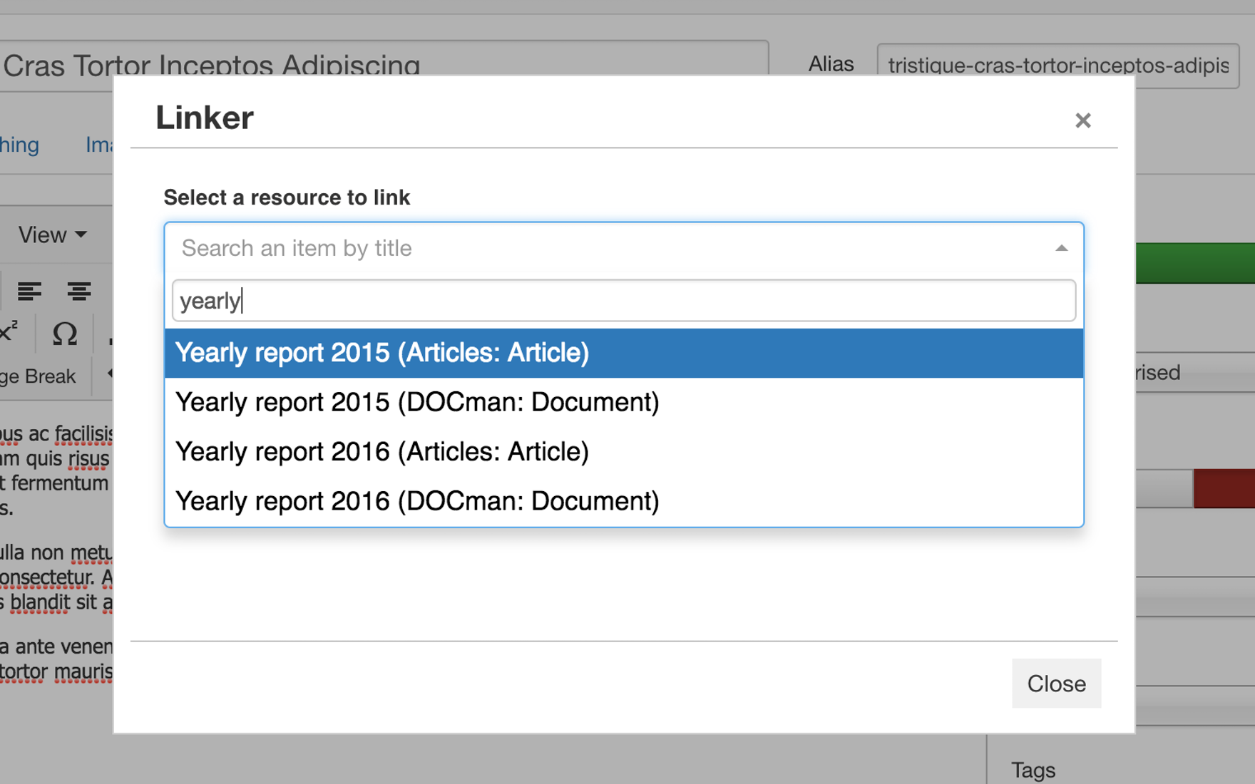 Support for LOGman Linker. Linker can find any linkable resource in your site and will prompt you with a list to choose from and insert into your article.