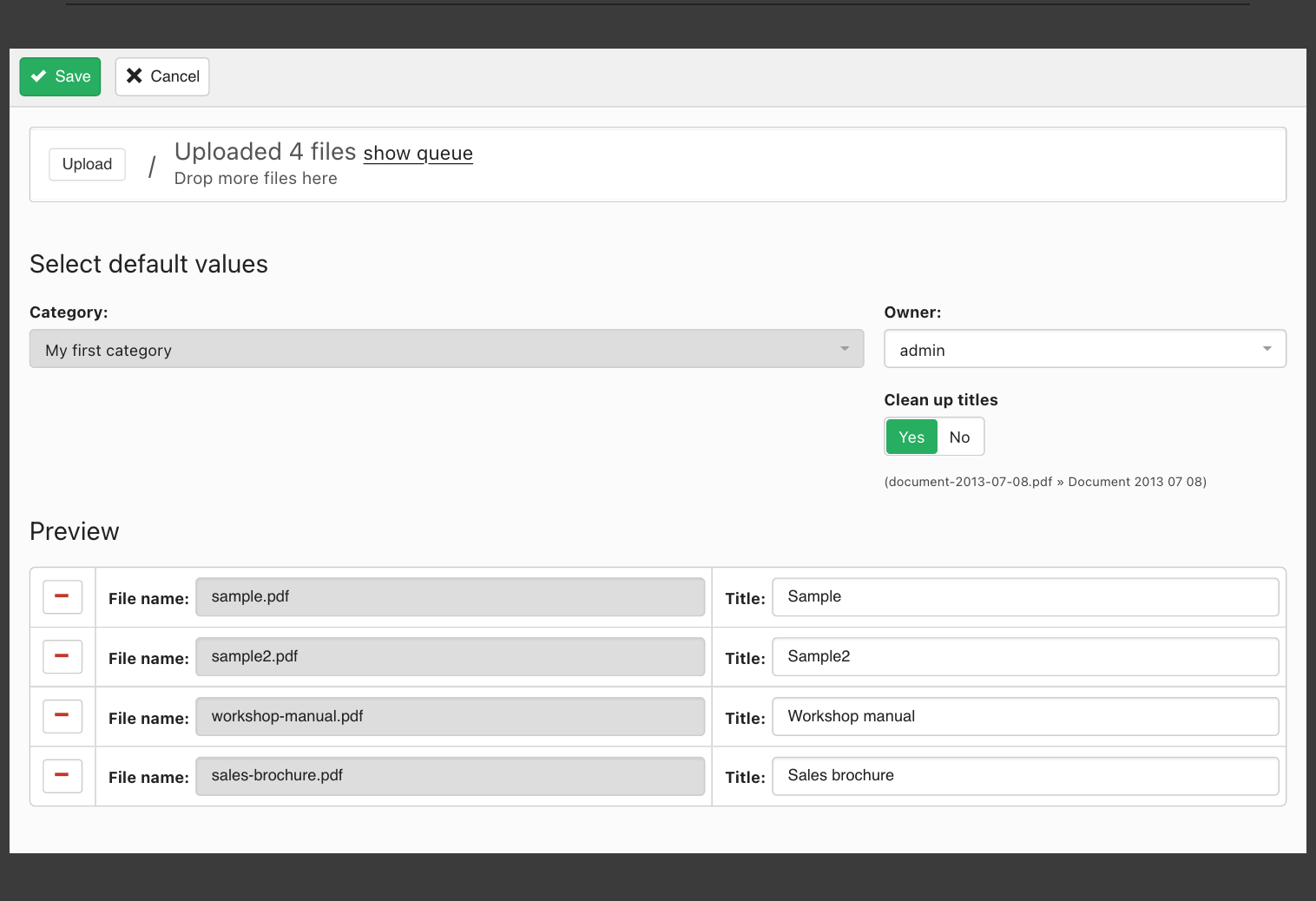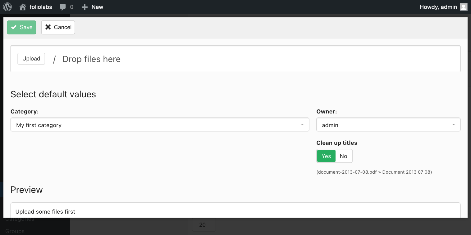 The file upload window allows you to upload multiple files and batch create documents for them on the fly. You can specify the title for each document and the category the document should be created into. You can also set the owner for the documents and choose to clean up the titles.
