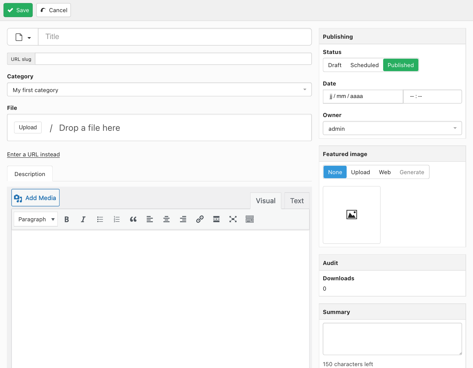 The URL slug field allows for defining the URL that will point to the document download link.