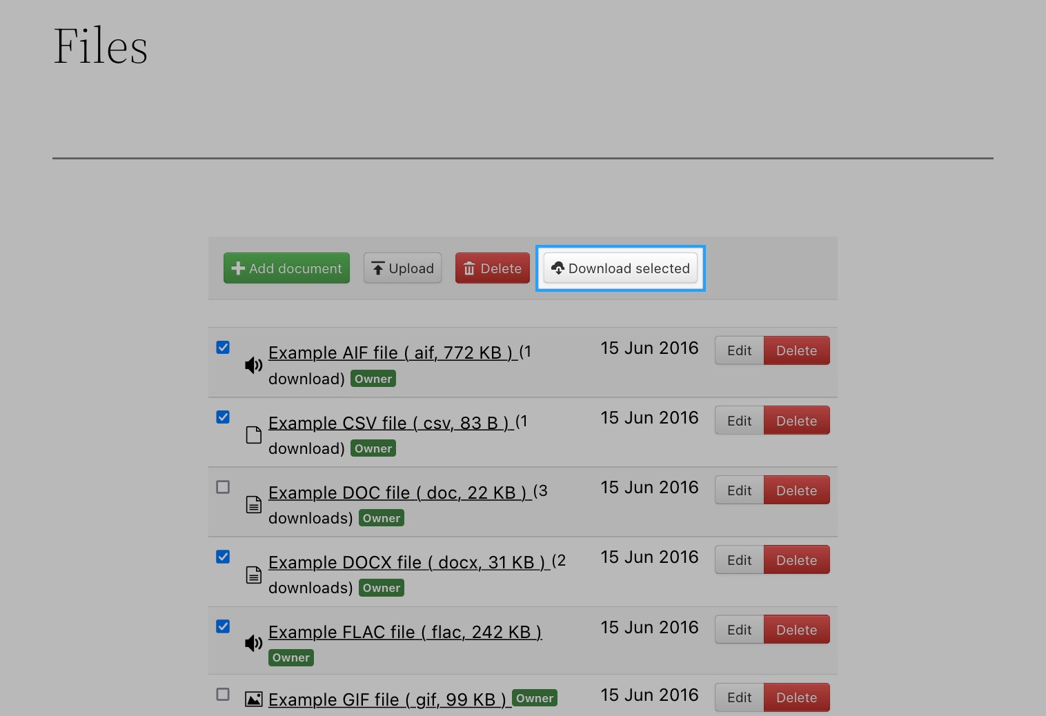 Your website users can download multiple documents at once, they can select which documents they want to download in the table and gallery layouts of the hierarchical list, tree list and flat documents list blocks. Clicking Download selected results in all of the selected documents being packaged up into a handy zip file ready to be downloaded onto the user's computer.