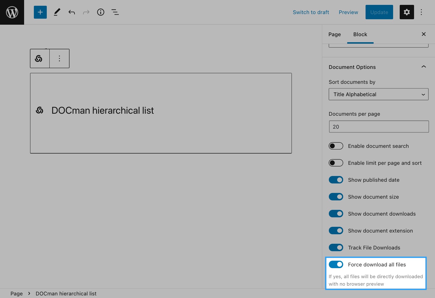If you don't want your users to view documents like PDF files in the browser, or play locally hosted audio and video files using the built-in media player, but instead download these files then you should set the Force download all files setting of the block's document options to enabled.