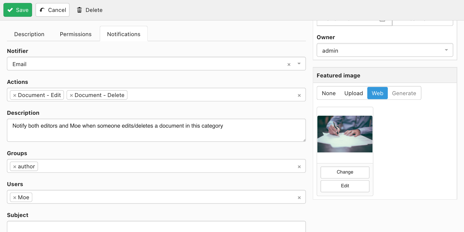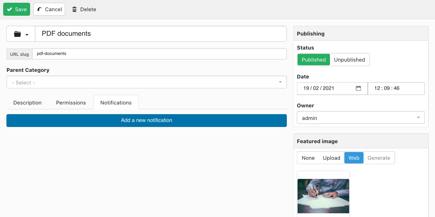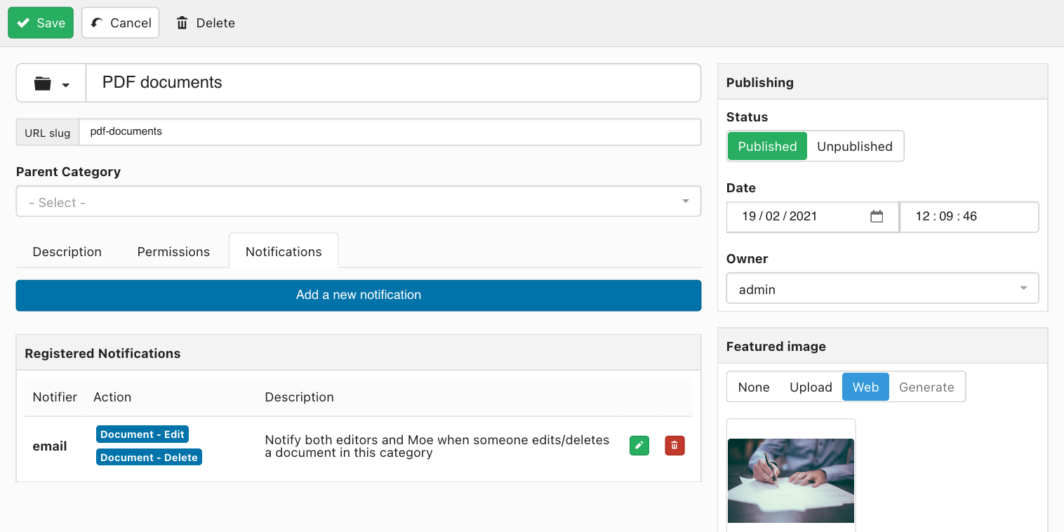 When editing an existing category, a new tab (Notifications) will be made available alongside the Description and Permissions tabs. By clicking on this tab a new selector will allow you to select the type of notification you would like to add.
