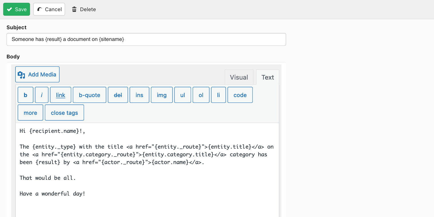 Naturally, the next step would be to provide a subject (optional) and a body for your notification. Some pre-defined body messages are provided by default depending on the selected action(s). You are of course free to define your own by simply editing the corresponding form fields.