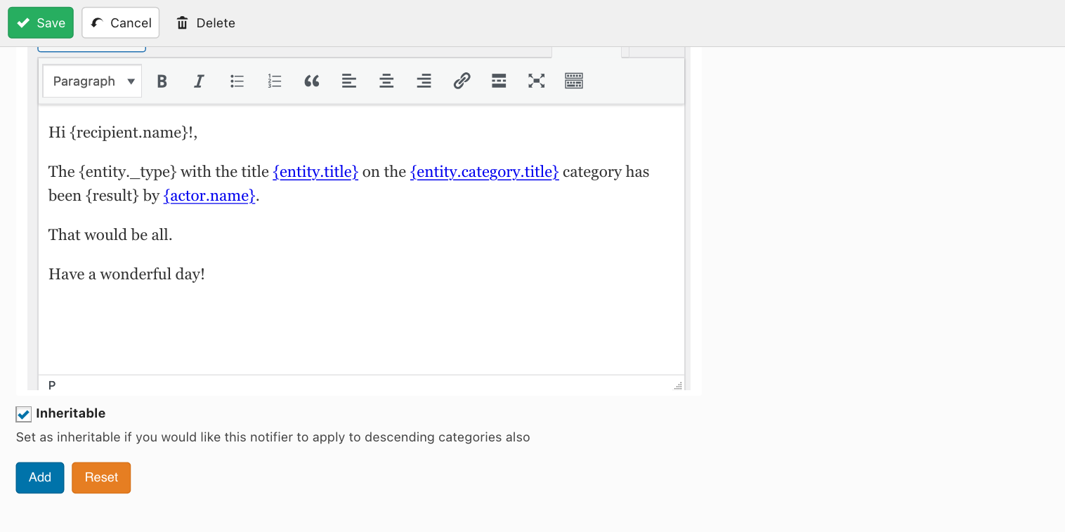 Finally you you are presented with an Inheritable checkbox and the notification form buttons (Add / Update / Reset). The checkbox enables/disables the inheritance behavior of the current notification. For example, if you would like the notification to only affect the current category and the documents inside then you should leave this checkbox unchecked, otherwise the notification also applies to the descending categories and their corresponding documents.