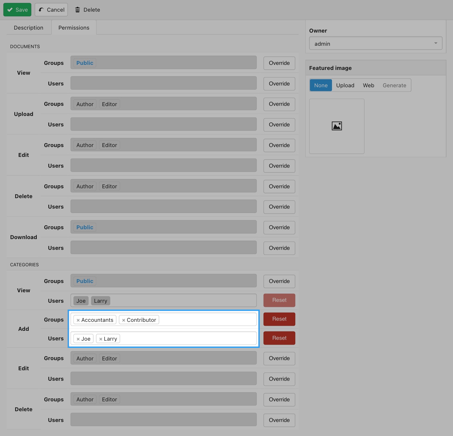 For this end you need to edit the corresponding category and then click on the Permissions tab located just at the right of the Description tab.