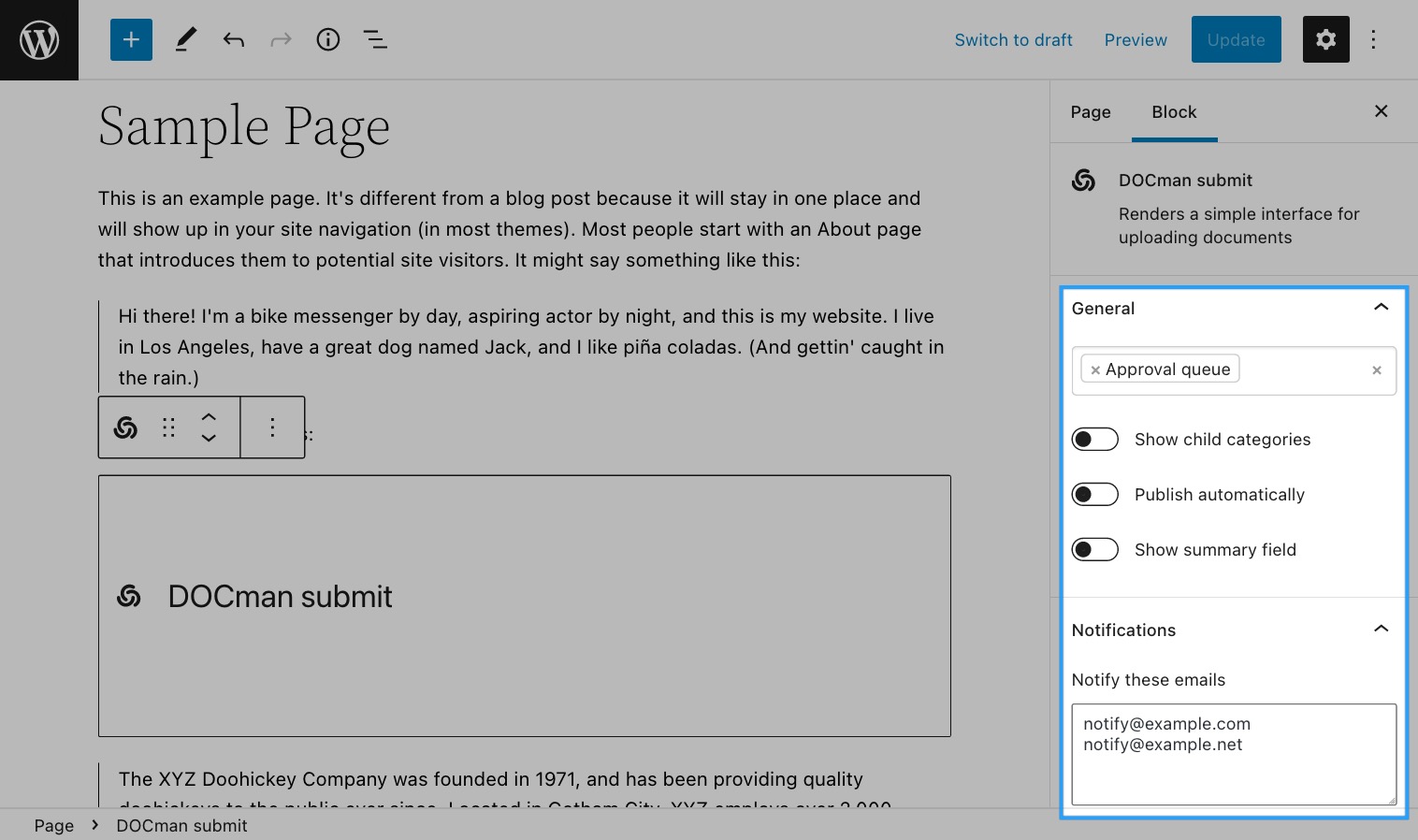 - In the block settings select the Notifications panel and add a list of emails you would like to notify when new documents are submitted, one email address per line.