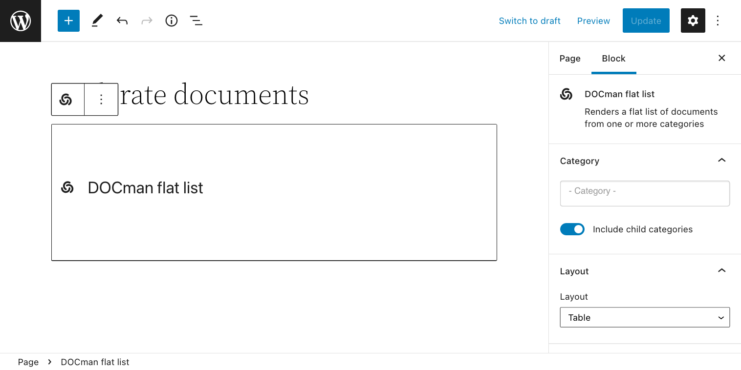 - Add a DOCman flat list block on a post or page of your liking