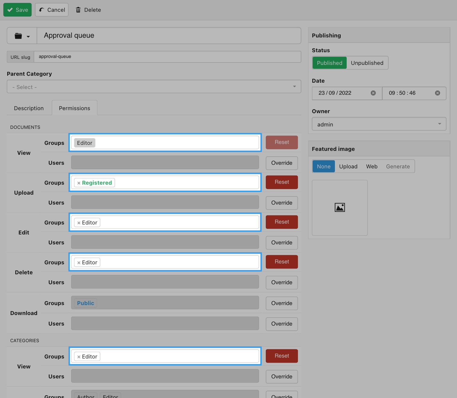 Note: The Editor group point to the Editors role in a vanilla WP install. Users having this role will be able to moderate the Approval queue category. If the Editor role has been modified or deleted then you may use any other role of your choice making sure that it is granted the publish_posts WP capability. Users with this capability are able to view DOCman documents in the frontend regardless of their published/scheduled state.